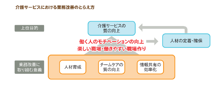 例)介護を構成する業務の一部(例えば入浴介助)を特定の職員に専門的・集中的に担当させる方法などが考えられます。この方法は当該担当職員の業務の習熟が進み、業務のスケールメリットが生まれるなどによって生産性が向上する可能性があります。ただしその一方で、スケールメリットは規模がある程度大きくなければ実現できない場合が多いことや、職員の業務内容を専門集中化させると、逆に単調な仕事に勤務意欲が薄れてしまい、結果として処理される業務の質・量が低下となってしまう場合があるなどの面も踏まえる必要があります(その場合定期的な職務ローテーションによってカバーする方法がある)。
