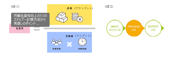一般的に生産性向上とは、従業員及び労働時間数あたりの付加価値額を設備投資や労働の 効率化などによって向上させるものとされます。生産性は、Output(アウトプット:成果)/ Input(インプット:単位 投入量)の分数で表し(図1)、少ないInputからより多いOutputが得られれば、生産性が「高い」という評価になります。また実際の生産性を向上させるためには、InputとOutputの間にあるProcess(プロセス:課程)に着目して取り組む重要性が指摘されます(図2)。